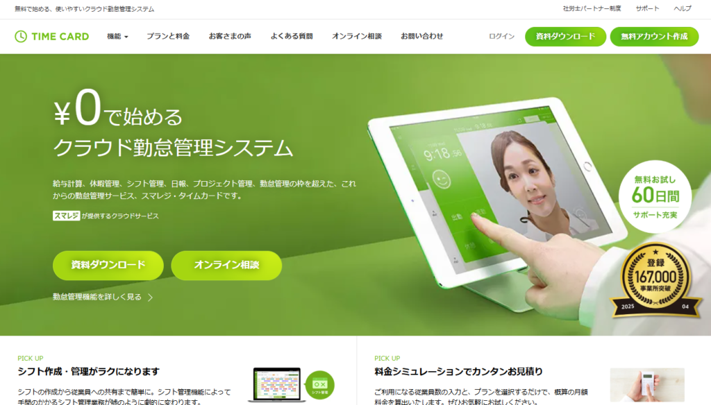 スマレジ・タイムカード | ・スタンダードプラン:10名まで無料、11名以上は1,210円/月(税込)~(11名以上で利用の場合:+110円/人) ・プレミアムプラン:10名まで2,420円/月(税込)、11名以上は+385円/人(税込) ・プレミアムプラスプラン:10名まで4,840円/月(税込)、11名以上は+495円/人(税込) | ・設定サポート無料 ・無料お試し60日間(コールセンター付) | 画面タッチ(GPS、顔写真撮影対応) |