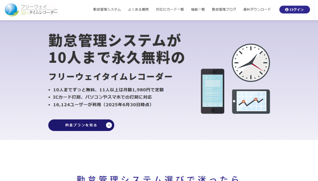 フリーウェイタイムレコーダー | 10人まで無料、11人以上は1,980円/月(税込) | ・10人まで永久無料 ・11人以上は何人でも月額2,178円(税込) | ICカード打刻、Web打刻(PC、スマホ、タブレット) |