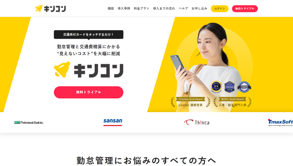 「キンコン」は、アプリ打刻はもちろん、ICカード打刻で交通費も同時に読み取り、経費精算にも活用できる勤怠管理システムです。