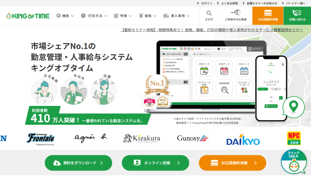 KING OF TIME | 330円/人(税込) | ・13種類の豊富な打刻方法(一部追加費用要) ・アルコールチェックや入退室管理と連携可能 | Web打刻(PC、スマホ、タブレット)、ICカード打刻、生体認証打刻 など |