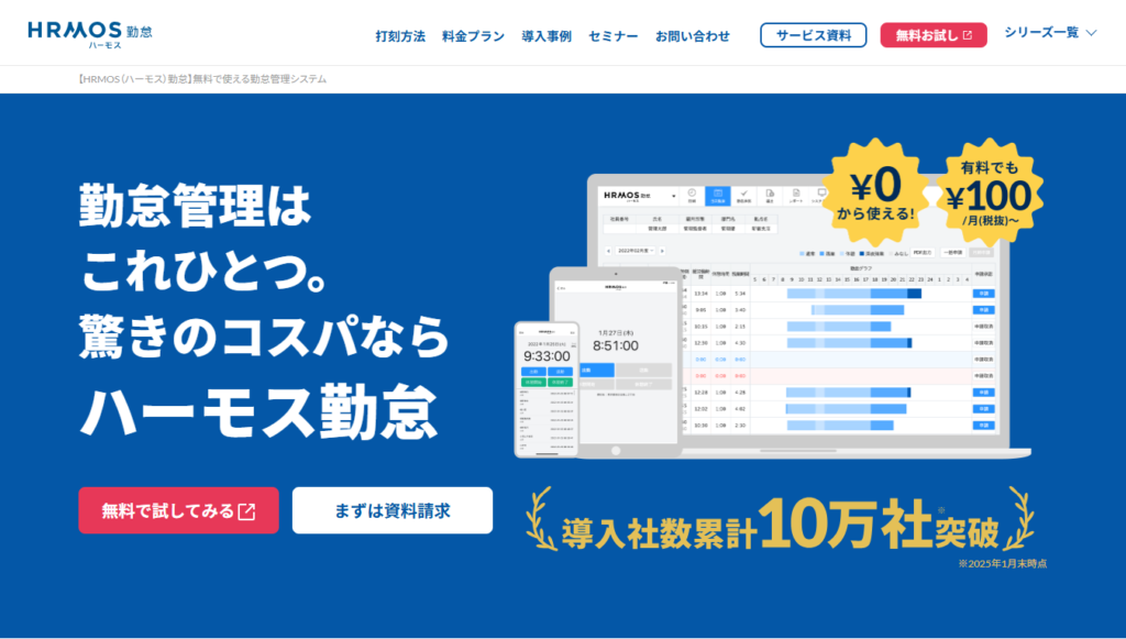 HRMOS勤怠(ハーモス勤怠) | ・30名以下:無料 ・31名以上:一人あたり110円/月(税込) | ・勤怠レポートやアラートにも対応 ・ワークフローなどの機能も充実 | Web打刻(PC、スマホ、タブレット)、QRコード、生体認証、SNS打刻 など |