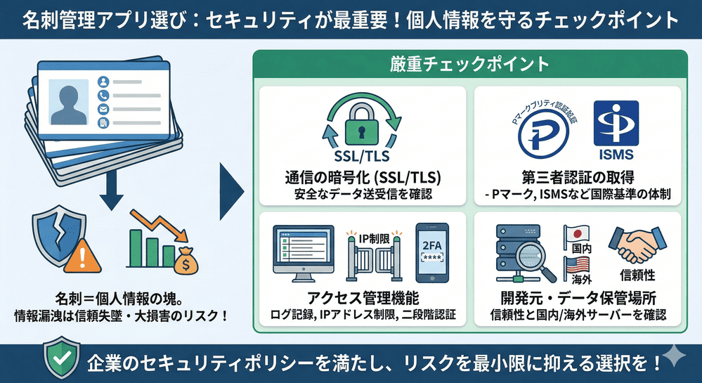 名刺には個人の氏名、連絡先、会社情報など、個人情報が多数含まれています。そのため、名刺管理アプリを選ぶ上で、セキュリティは最も重要な選定基準の一つです。