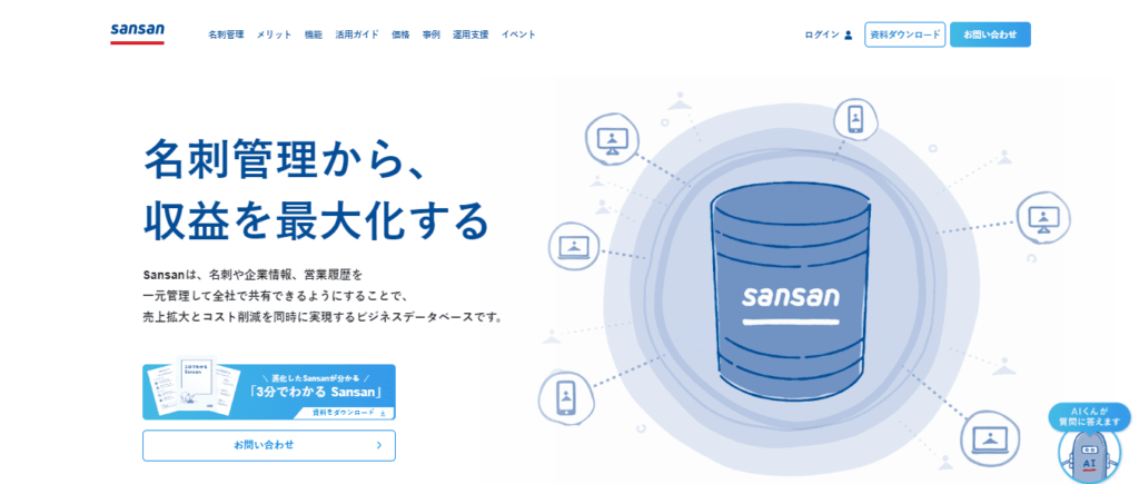 Sansan初期費用+月額基本料金 (要問い合わせ)法人向け名刺管理サービス市場シェア No.1。人脈可視化と営業力最大化。個別相談・デモ提供SAML認証二要素認証必須化アクセスコントロールスマートフォンアプリ利用制限