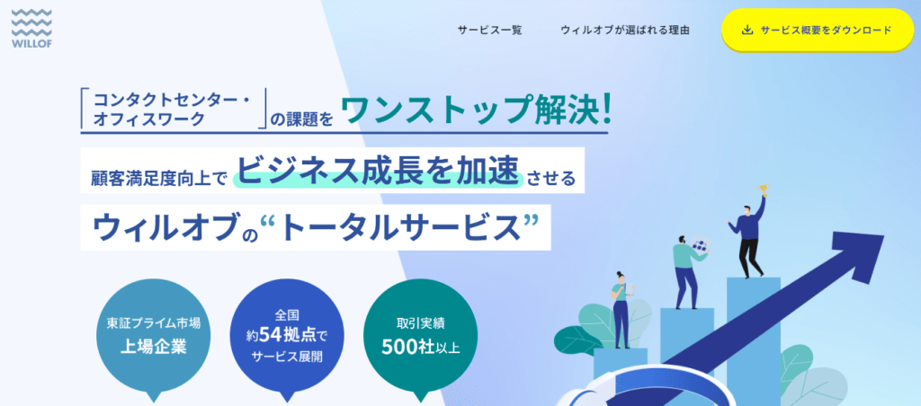 ウィルオブはコールセンターに特化した人材派遣をはじめ、業務委託や人材紹介などを行っている代行会社です。通信・金融・公共サービスなど業界・業種を問わず対応できます。在宅化支援や、BCP対策の相談も可能です。