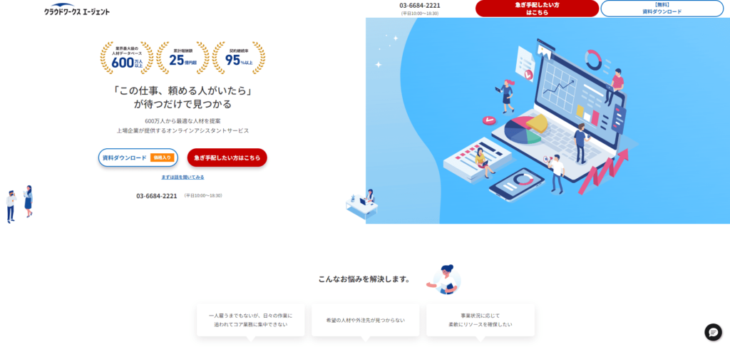 クラウドワークス エージェントは、国内最大級のクラウドソーシング「クラウドワークス」が提供する、ハイスキル人材とのマッチング型オンラインアシスタントサービスです。