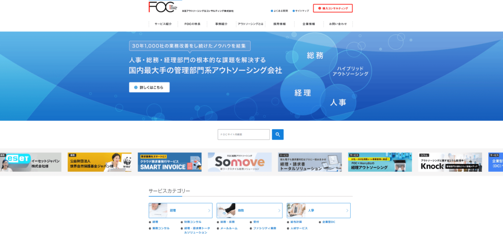 FOCは、経理・総務・人事・ITなど企業の管理部門全体に対応するトータル型アウトソーシングサービスです。30年以上で1,000社超の支援実績があり、業務代行にとどまらず、RPA・AI・クラウドなどのIT活用を組み合わせた“ハイブリッド型”の支援が強みです。