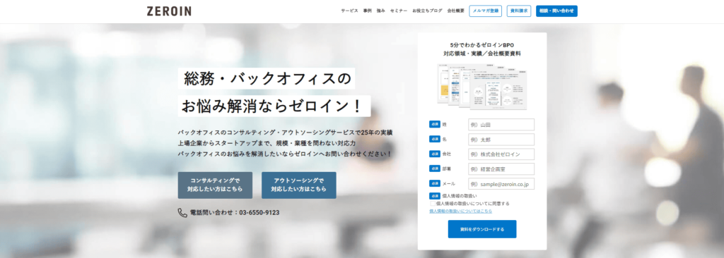 ゼロインは、総務・人事・研修・移転対応など、企業のバックオフィス業務を一括して担う常駐型アウトソーシングサービスです。