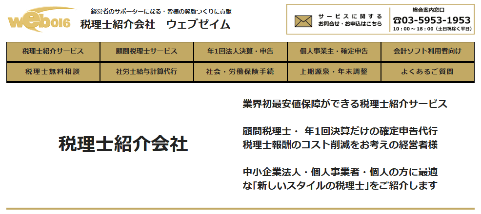 「ウェブゼイム」は、税理士を紹介するサービスを行う会社です。紹介料は無料で、さらに「最低料金保証付き」であることから、業界最安値を売りにしています。