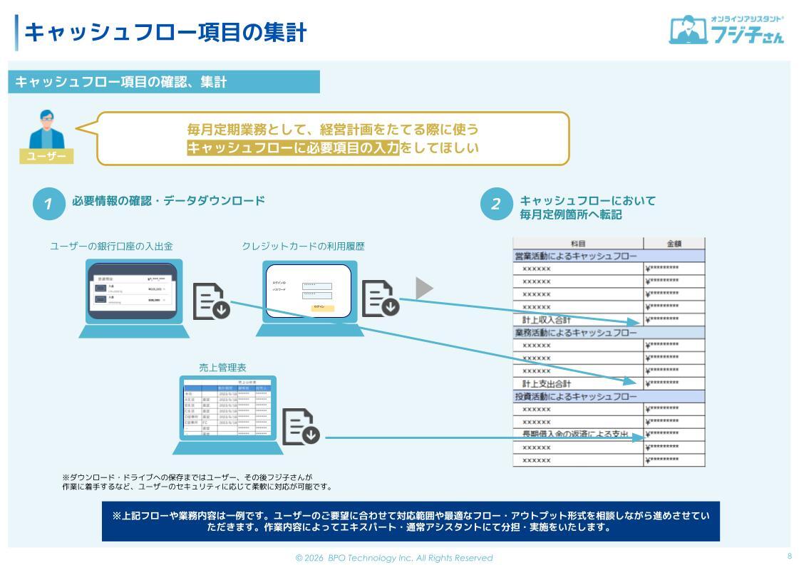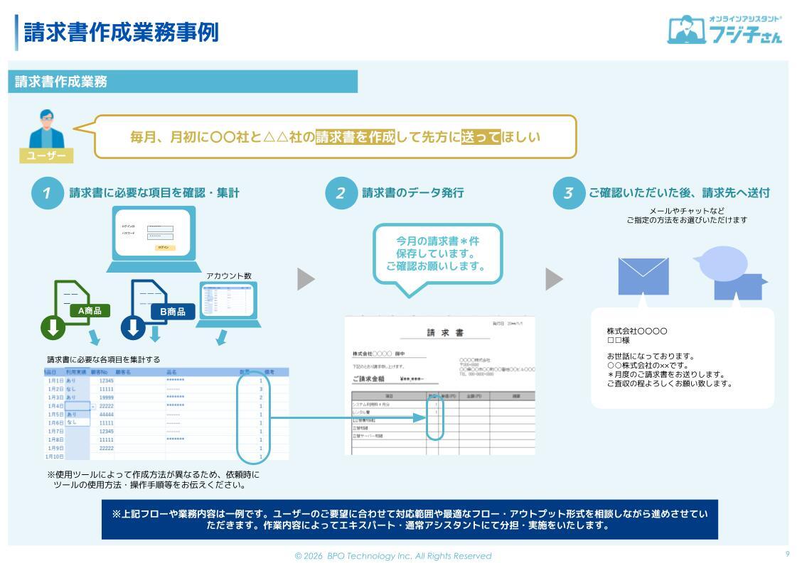 ヒアリングや画⾯共有にて作業レクチャーいただき、それを基にフジ⼦さんにてマニュアル作成が可能。新しく⼊社される⽅などへフジ⼦さんから引継ぎ対応も可能です。育休・休職な一時的な代替要員にも最適です。